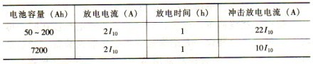 1)100%容量沖擊電流放電能力。當(dāng)蓄電池容量達(dá)到滿(mǎn)容量時(shí),對(duì)容量為50~200Ah的電池用25I10沖擊電流值,容量大于200Ah的電池用20I10沖擊電流值,沖擊l0次,每次500ms的沖擊放電,每?jī)纱畏烹姇r(shí)間問(wèn)隔為2s,直流母線(xiàn)的電壓不得低于90%UN(UN為直流系統(tǒng)額定電壓)。