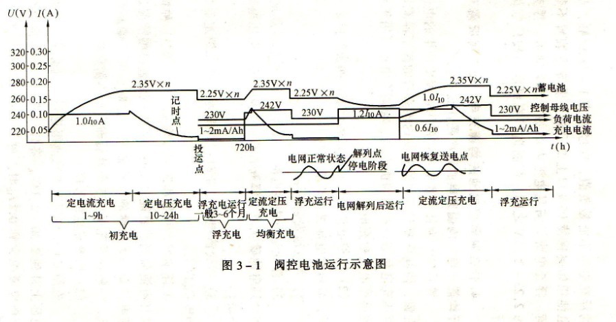 閥控電池組完成初充電后,即可轉(zhuǎn)為浮充電方式運行。對于變(配)電所只有一組蓄電池時,浮充電就是充電裝置首先應滿足直流負荷的要求,另外還要以小電流滿足電內(nèi)部的自放電要求。所以浮充電電流值等于直流負荷電流+浮充電流。浮充電補償電池內(nèi)部的自放電和外殼表面臟污后所產(chǎn)生的爬電損失。除直流負荷電流外,真正充進電池內(nèi)