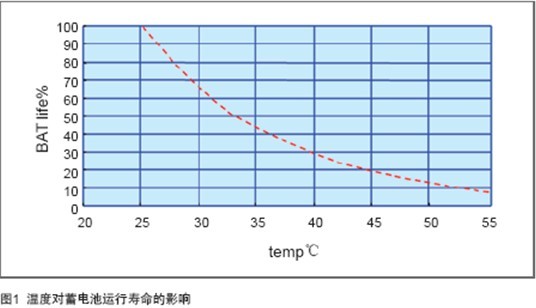失水的途徑比較多:節(jié)流閥設(shè)計(jì)不合理,頻繁開啟;電源對(duì)蓄電池頻繁均充;環(huán)境溫度過高。其中高溫是最主要的因素,高溫會(huì)加速蓄電池失水速度,導(dǎo)致蓄電池容量下降。以25℃為基準(zhǔn),當(dāng)蓄電池運(yùn)行環(huán)境上升10℃,壽命減少50%,如圖1所示。