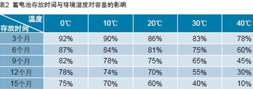 蓄電池在存放過程中存在自放電,如果長(zhǎng)時(shí)間得不到補(bǔ)充,就會(huì)出現(xiàn)硫酸鹽化現(xiàn)象。這種現(xiàn)象如果沒有得到及時(shí)改善,蓄電池容量會(huì)降低甚至損壞不能使用。蓄電池在存貯過程中,環(huán)境溫度對(duì)容量影響也非常大,如表2所示。